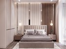 У спальні всюди прослідковуються лаконічні лінії - стінові панелі та елементи меблів.