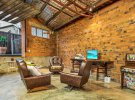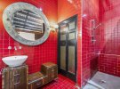 Крім цегляних стін, бетонної підлоги йвідкритих балок, в дизайні дивує ще й червона ванна кімната. За будинком є сонячний дворик для затишного сімейного відпочинку.