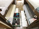 Зекономити простір у фургоні допомогли зроблені на замовлення меблі-трансформери. Це дитячі ліжка із вбудованими шухлядами й можливістю легко трансформуватися в зручні канапи. Також обідній комплект, який без зусиль можна перетворити на просторе спальне місце.