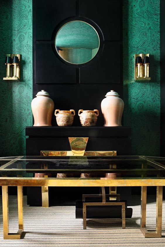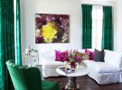 Смарагдово-зелений належить до числа темних, глибоких відтінків. Має водночас ефектний і вишуканий вигляд. Ідеально поєднується з нейтральними кольорами, відтінками металу, темного дерева й дорогоцінних каменів. Виграшно виглядає в комбінації з оксамитовою текстурою й глянцевими поверхнями.