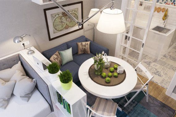 У невеликих кімнатах часто доводиться іти на компроміси. Наприклад, поєднувати зону відпочинку із перекусом.