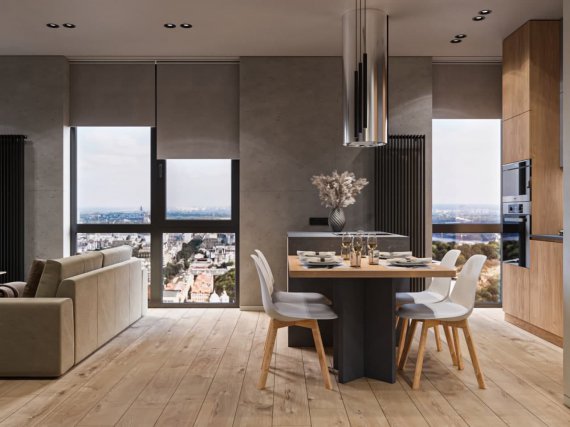 Інтер'єр кухні-вітальні виконаний в сірих відтінках з дерев'яними та графітовими елементами. Кухню та вітальню умовно розділяє острів для приготування їжі з хромовою витяжкою, а також обідній стіл на чотирьох людей.