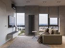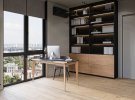 Робочий кабінет об'єднали з балконом, де розмістили лаунж зону з панорамними вікнами. Ідеальне поєднання - після плідної роботи можна посидіти з чашечкою кави.
