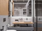 Справа від дивану за графітовою тонованою перегородкою знаходиться санвузол, який повністю підтримує стилістику квартири. Скло повністю тоноване зі сторони вітальні.