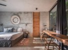 У будинку поєднані бетону та дерева, які довершені скляними поверхнями. Великі вікна та розсувні скляні двері компенсують холодний характер бетонних стін та стелі.