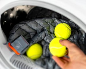 В процесі прання потрібно використовувати чотири або п'ять тенісних м'ячиків. Не використовувати звичайний порошок, а додавати рідкий засіб для прання.