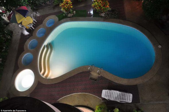 Басейн у формі сліду правої ноги. Ця креативна споруда знаходиться на території філіппінського міні-готелю Apartelle de Francesca. Її форма повторює зображення, яке слугує логотипом цього закладу.