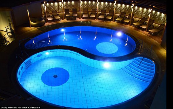 Басейн-інь-ян. Надихнувшись зображенням символу протилежних сил, власники австрійського готелю Posthotel Achenkircht задумали не лише форму його відтворити. Щоб дотриматися початкового задуму, у басейн вирішили заливати воду різної температури: у одну частину — прохолодну 17-градусну, у другу — теплу 34-градусну.