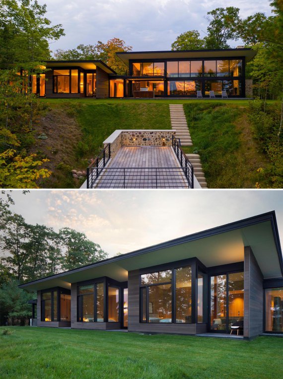 Мало хто не мріє жити біля озера і лісу. Так подумали і дизайнери Vetter Architects. Вони спроектували будинок в американському штаті Вісконсін у місті Лак-дю-Фламбо. архітектура вражає поєднанням матеріалів - польовий камінь, дерево та скло. Вони плавно сплітаються між собою