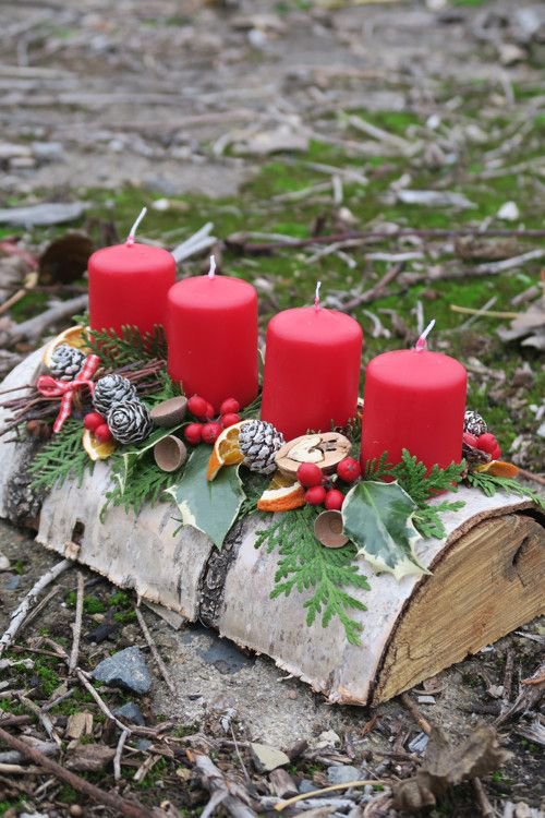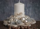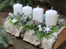 Таку композицію можна зробити своїми руками. Є багато красивих ідей і фото. Для її створення знадобляться шишки, ялинкові кульки, кілька гілок ялинки, кружальця підсушених апельсинів, свічки, кольорові стрічки, сніжинки, штучні квіти, фігурки діда мороза чи щура.