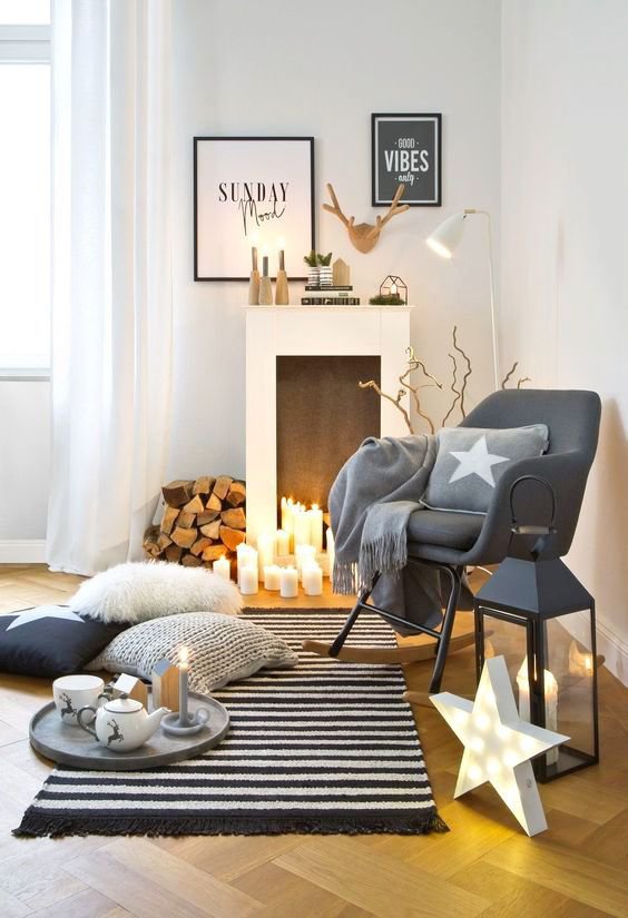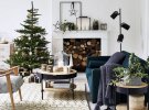 У скандинавському святковому декорі майже не буває натуральних ялинок. Їх заміняють на кімнатні, набір гілок чи з дощечок. Ніяких дощиків та мішури, хіба що гірлянди. У святковому варіанті це можуть бути паперові ялинки, шишки, цитруси. Дуже популярними є паперові зірки, які світяться, такими можна прикрасити вікно.