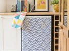 В якості альтернативи покрийте передню частину побутового приладу залишилися рулоном шпалер, прикріпленим двосторонньою липкою стрічкою. Або приклейте до поверхні і покрийте лаком.