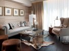 Цей інтер'єр не слід візуально обважнювати великою кількістю щільної тканини. Наприклад, можна використовувати яскравий килим, який буде окреслювати простір для відпочинку. Або покласти пару подушок з цікавим візерунком або в смужку, покласти теплий в'язаний плед на крісла біля каміна.