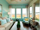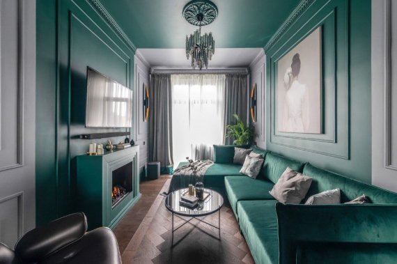 Для невеликих за площею приміщень ідеальним рішенням стануть візуально розширюють простір світлі відтінки зеленого. А такі одночасно строгі та насичені тони, як хвоя, темна бірюза або смарагд, стануть ідеальним рішенням для створення інтер'єру в віталень великого розміру.