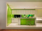 Багато відтінки салатового ідеально виглядають в інтер'єрах в стилі хай-тек. Металеві і скляні предмети, прямі стрімкі лінії, стриманий декор і застосування новітніх технологій в побутових приладах - це все характерні риси цього стилю. Кухню в такому випадку часто поєднують з вітальні за допомогою барной стійки.