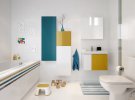 Жовта фарба на стіні будить ванну кімнату. У поєднанні з насиченим синім відтінком сонячний колір висвітлює всю кімнату. Щоб переконатися, що ви вибрали правильний відтінок, робіть акцент на сильному жовтому, забуваючи про більш світлих, майже позбавлених смаку варіаціях. У ванній кімнаті аксесуари, наприклад, рушники, дають можливість повторити цей сліпучий тон.