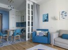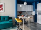 2. Створити ефект єдиного простору допоможе поєднання колірних рішень. Можна зробити фасади кухні і стіни одного кольору. Інший варіант - вибрати 2-3 основних кольори і повторити їх по всьому простору вітальні-кухні або квартири-студії. Такі рішення будуть згладжувати різкий перехід між зонами в просторі.