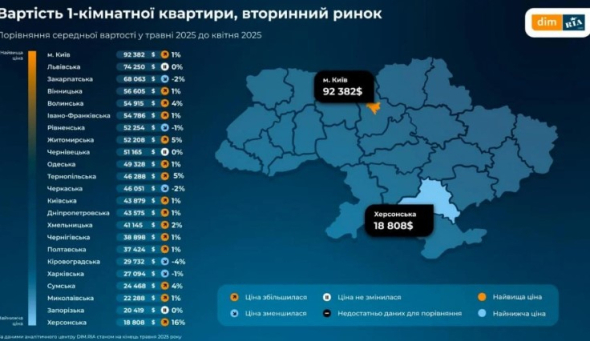 Найбільша кількість оголошень про продаж вторинного житла у травні надходила з Волинської, Рівненської та Миколаївської областей. Згідно з даними дослідження, впродовж травня середня вартість однокімнатних квартир продовжує зростати у більшості регіонів України. Найбільший ріст зафіксовано у Херсонській області (+16%), хоча вона залишається найдешевшою за цим типом житла.