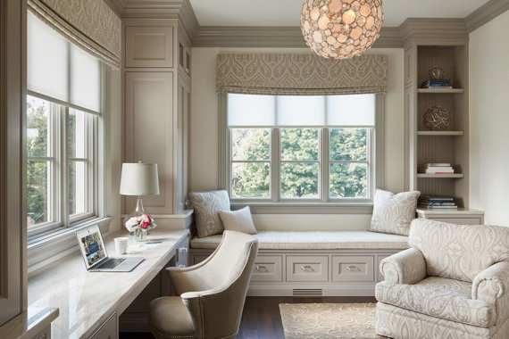 Наприклад, замість столу можна використовувати секретер або відкидну стільницю, стільницю як продовження підвіконня. Стіл можна облаштувати в ніші або в секції вбудованої шафи - це дозволить приховати робочу зону від сторонніх очей.