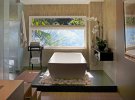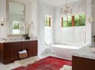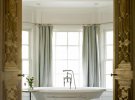 Вдалим рішенням є поєднання ванної з елементами вітальні. Вікно можна оздобити шторами до підлоги. Це додасть кімнаті затишку й комфорту. Також буде доречно облаштувати м'який куток для відпочинку. Приміром, встановити поруч із ванною кушетку чи м'який лежак.