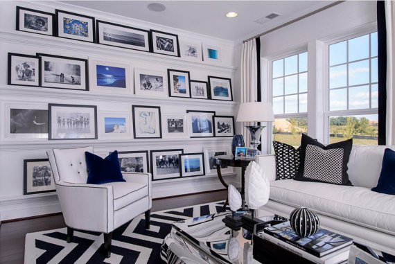 Певний ритм, врівноваженість, спокій і комфорт додасть лаконічна галерея з фото або картин, розміщених ідеально симетрично по строгим лініям квадрата, прямокутника або в одну лінію.