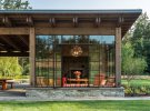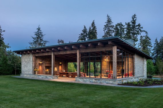 Ця однорівнева споруда з великими вікнами та скляними стінами побудована з каменю та дерева. Ця палітра матеріалів допомагає їй вписатися в місцевий просторіччя, а також надає йому справді затишну атмосферу.