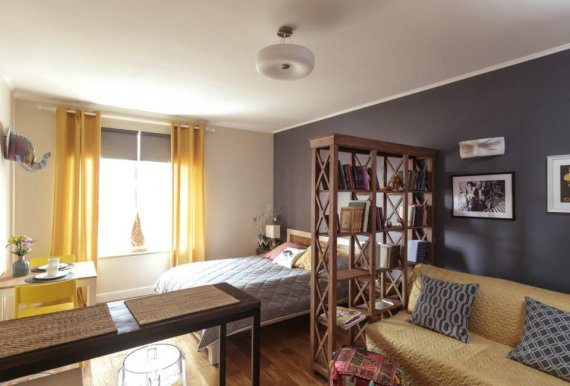 Оборотні способи ж більш практичні і прості у виконанні. Це планування світлом, акцентами на квітах і меблів, штори, а також установка перегородок. Одним з найпопулярніших і вдалих способів зонування постає стелаж, який за рахунок своєї габаритності прекрасно розділяє приміщення. При цьому зберігаючи цілісність приміщення.