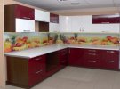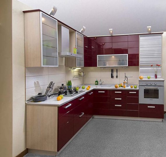 Бордовий гарнітур розкішно виглядає в поєднанні з молочним, бежевим і шоколадним відтінками. У таких тонах може бути виконана стільниця і фартух, деталі меблів, рами для фасадів, фурнітура, дверцята побутової техніки.