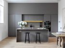 Монохромна сіра кухня може бути не дуже затишною. Зате вона не буде дратувати і втомлювати, як, наприклад, червона або чорна кухня. У сірій кухні людина відчуватиме себе спокійно. Для більшого затишку, варто розбавити відтінки сірого природним кольором дерева. Якщо, наприклад, кухонні меблі сіра, відтінок сірого можна вибрати і для стін, а ось підлоги краще зробити дерев'яними. Це робить інтер'єр м'якше.