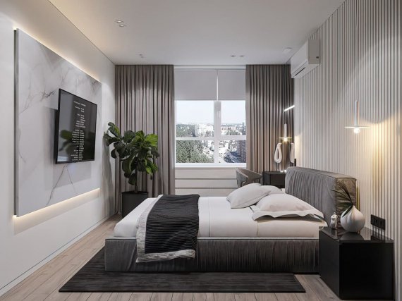 Спальню щзробили так, щоб жителі мегаполісів могли усамітнитися в нейтральній домашній обстановці. Там поставили комфортне ліжко, будуарну зону біля вікна, а за тонованою скляною перегородкою знаходиться містка гардеробна.