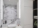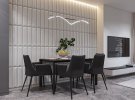 Зручно поєднувати білий, сірий та графітовий відтінки. Для кухні обрали світлий колір, де акцентом виступають стільниця, фартух та верхні фасади. Біля обідної зони додали об'єму приміщеню за допомогою гипсових 3д панелей.