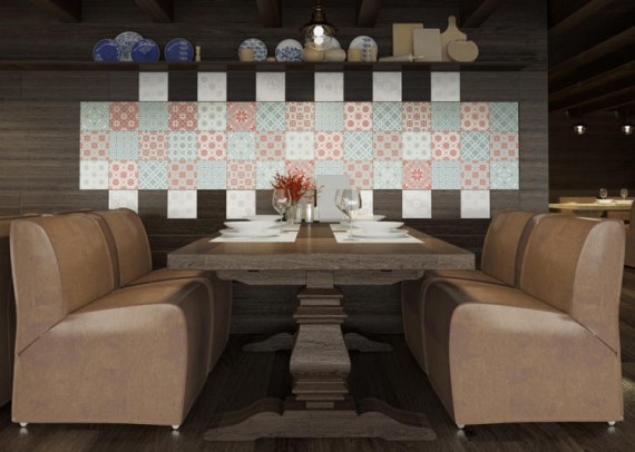 Вишивані елементи можна побачити у іспанській колекції керамічної плитки Almera Ceramica. Тут переважають червоні, чорні та сірі відтінки.
