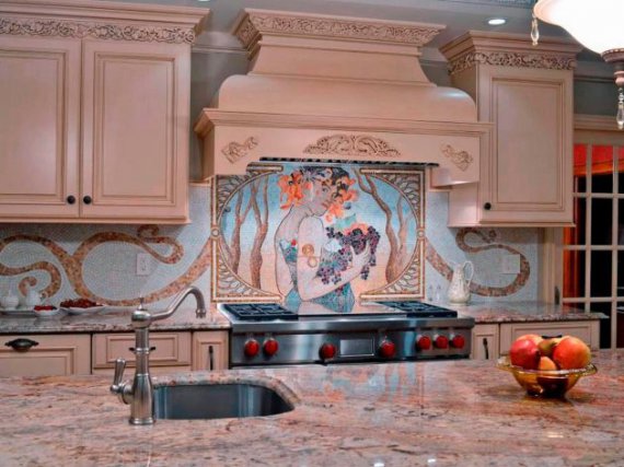 Мозаїка на кухонній стіні дозволяє одним махом досягти подвійної вигоди. З одного боку, надає інтер'єру привабливого й неординарного вигляду, з іншого — захищає стіни від забруднень, появи яких практично неможливо уникнути під час приготування їжі.