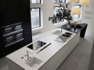 Кухня у чорно-білих тонах виглядає стильно та вишукано. Дзеркальні і скляні вставки в кухонних шафках – прекрасна ідея дизайнера, яка візуально полегшує сприйняття темного кольору меблів.
