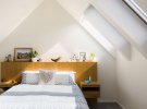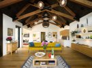 Великі оголені балки створюють на стелі чіткий хрестовий малюнок і привертають увагу до даху. Там створюють враження відкритого простору. Мансардні світильники, підкреслюючи висоту приміщен.