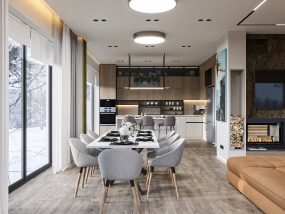 Перший поверх поділили на кілька функціональних зон. Відразу після приходу видніється лаунж зона з теракотовим акцентним диваном і каміном. Він додає затишку та створює домашню атмосферу. Кухня у світлих тонах з дерев'яними фасадами. Її та обідню зону умовно розділяє стильний острів.