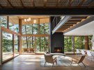 Про житло у лісі мріють як любителі розміреного життя, так і просто відпочинку від міста. Якраз таким є дерев'яний дім з великими панорамними вікнам. З них відкривається пейзаж на озеро та ліс. Це допомагає тримати зв'язок між людиною та природою.
