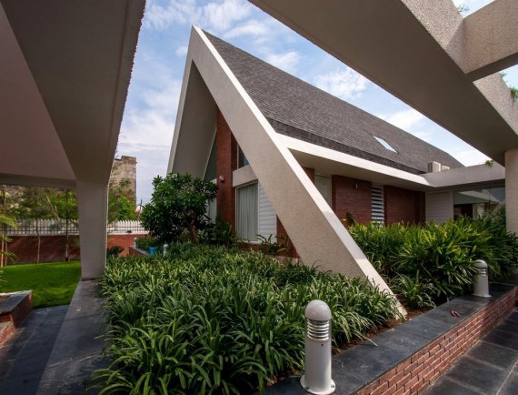 В індійському місті Ратлам збудували дім з трьома двосхилими дахами, які з'єднані між собою внутрішнім двориком із басейном.