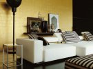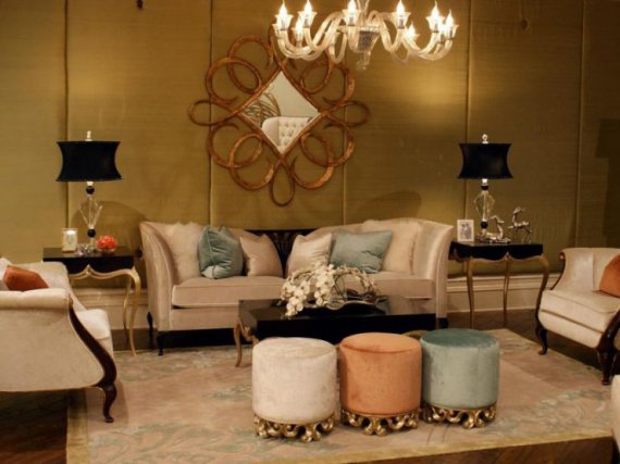 Щоб створити золотий інтер'єр вітальні в мінімалістичному стилі досить з'єднати даний колір з модними матеріалами і монохромного забарвленням. Відтворити бароко допоможуть золоті статуетки і відповідний текстиль.