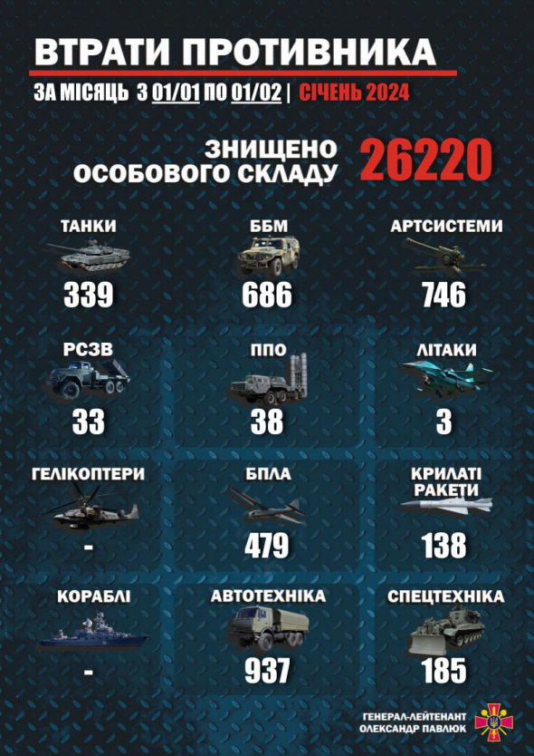У січні ЗСУ знищили ще 26 220 російських загарбників та 3 584 одиниці техніки ворога, повідомив 1 лютого у Telegram перший заступник міністра оборони України генерал Олександр Павлюк.