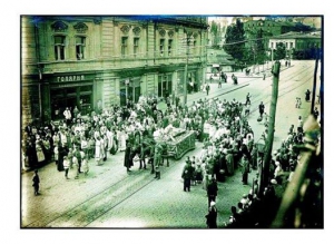"Друзі, а зверніть но увагу на вивіску на протилежному боці вулиці. Це Київ 1920 року – процесія з гробом художника Георгія Нарбута проходить біля Думської площі (сучасний Майдан Незалежності). Фото НХМУ. Це я до фрази "Кієв всєгда бил рускоязичним". Точно, всєгда?" – написала Ніцой.