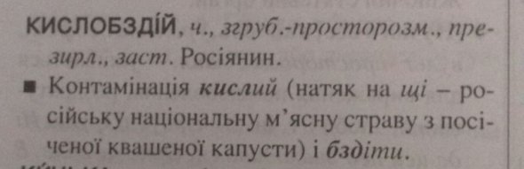 Складається із двох частин. Значення "кислий" - натяк на щі - російську національну страву з посіченої квашеної капусти. "Бздіти" - випускати гази, пишуть у спільноті Facebook "Українська мова для всіх".