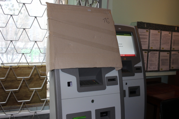 "Не стій у черзі — плати он-лайн", - закликають на сайті "Ощадного банку" та через плакати у відділеннях. Без черг можна сплатити через сайт або термінал у відділенні банку. Тут стоять два термінали. Один заклеєний скотчем та картоном, у іншому на екрані світиться повідомлення, що з технічних причин він не працює. Одного клієнта касир відпускає за 5-7 хвилин. В середньому кожен з клієнтів робить 2-3 платіжні операції.