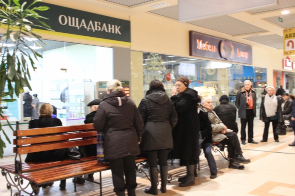 За перші півгодини роботи у суботу, 21 січня, відділення на проспекті Правди, що на Виноградарі, вишикувалося в чергу 32 клієнти. Їх обслуговує один касир.