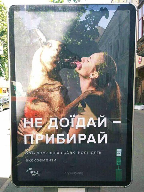 Рекламний постер містить напис: "Не доїдай - прибирай. 85% домашніх собак іноді їдять екскременти".