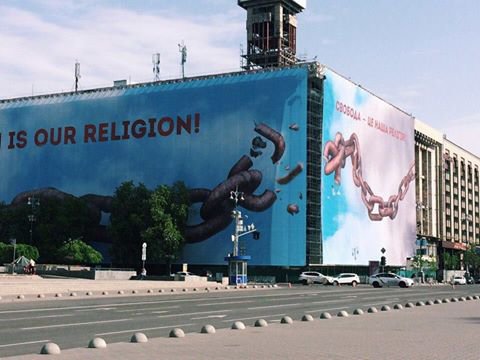 Напередодні пісенного конкурсу Євробачення обгорілий Будинок профспілок закрили банером. На ньому напис англійською - "Свобода - наша релігія".