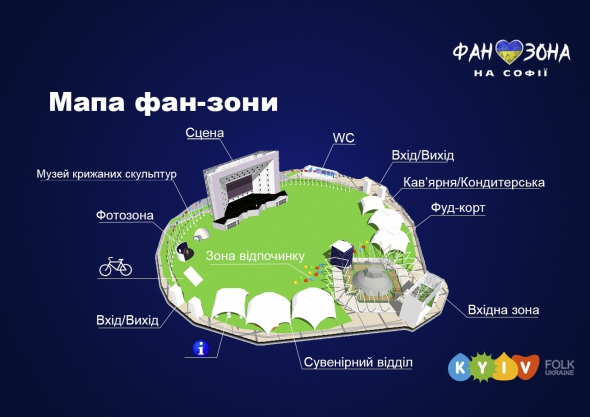 На території фан-зони розмістять прапори усіх країн-учасниць Євробачення. Тут буде велопарковка, фуд-корт, музей крижаних скульптур і зона відпочинку з м'якими кріслами-мішками.