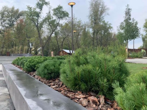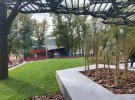 На вході встановили нові стилізовані лавки і урни, облаштували ландшафтний дизайн.