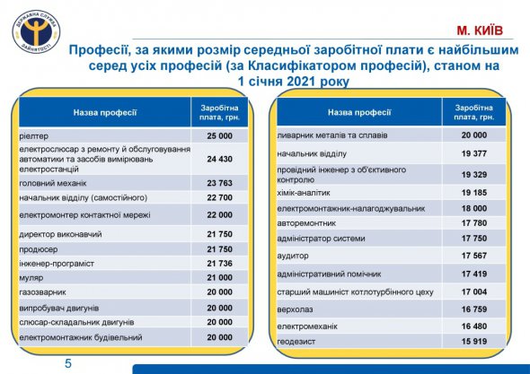 "Найвищий середній розмір оплати праці пропонується для рієлтора - 25 тисяч гривень, електрослюсаря з ремонту й обслуговування автоматики та засобів вимірювань електростанцій - 24,4 тисячі гривень, головного механіка - 23,8 тисячі гривень", - розповіли у центрі зайнятості для "Укрінформу".
