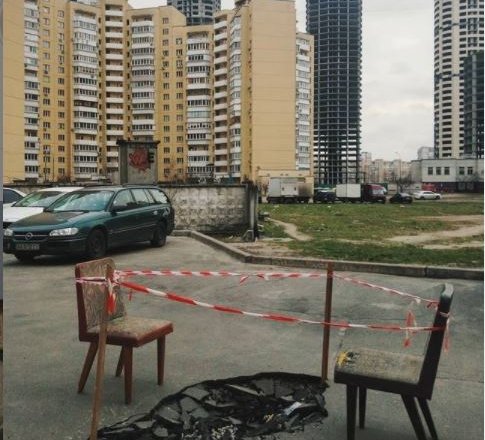 На світлині видно, що яму обнесли попереджувальною стрічкою, зафіксувавши її не спеціальним обладнанням, а двома стільцями.
